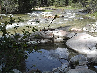 Buckhorn Creek and fording on a fallen tree to the meadow campsite I