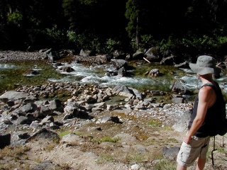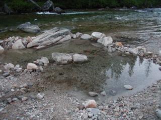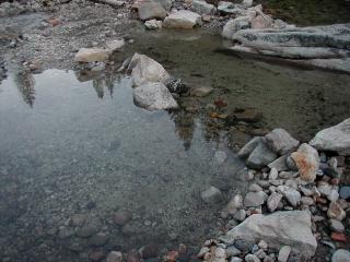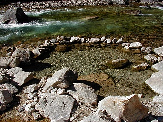 The pool by the river was at a near perfect temperature. I say 'near' perfect because there were semi-frequent blasts of hot and cold which were easily dealt with by an occasional swirling motion. The bottom of the pools were lined with river rock and gravel with no slick stuff or silt anywhere to be seen. The water was very clear and no sulfur or other smells were noticed. We lucked out having this to ourselves for almost a couple hours. Upon our arrival we witnessed 6 women and a couple heading the opposite direction, and just as we were leaving we ran into two couples that were